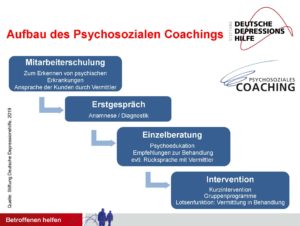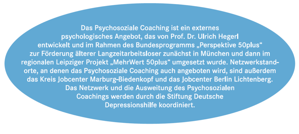 - Für die Teilnehmer erfolgt der Zugang zum Psychosozialen Coaching über die Vermittlungsfachkräfte des Jobcenters. Diese werden geschult, u.a. zu den häufigsten psychischen Erkrankungen und zur Gesprächsführung und so in die Lage versetzt, bei Anzeichen einer psychischen Erkrankung ihren Kunden das Psychosoziale Coaching anzubieten.