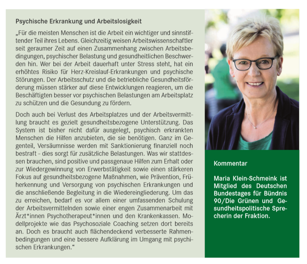 forum arbeit (01|19) – Es besteht Handlungsbedarf!: In der öffentlichen Wahrnehmung und selbst von Fachleuten werden Depressionen noch zu häufig als Reaktion auf schwierige Lebensverhältnisse eingeordnet. Dass es sich um eine eigenständige, oft schwere Erkrankung handelt wird so oft verkannt.
