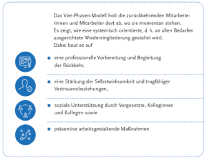In dieser Phase kehren die Beschäftigten an den Arbeitsplatz bzw. in den Betrieb zurück. Ideal ist dafür die Stufenweise Wiedereingliederung (STWE) als therapeutische Maßnahme, bei der die Zurückkehrenden – noch krankgeschrieben – ihre berufliche Belastbarkeit erproben, neue Verhaltensweisen trainieren und ihre Selbstwirksamkeit stabilisieren. Die zurückkehrenden Beschäftigten, ihre direkten Vorgesetzten, Kolleg:innen, betriebliche Vertrauenspersonen sowie BEM-Beauftragte, Betriebsärzt:innen als auch externe Expert:innen (bei Bedarf) gestalten den Prozess. Erfolgsfaktoren sind konstruktiv zusammenzuarbeiten, sich gegenseitig zu unterstützen und ein vertrauensvoller Umgang miteinander. Ein wichtiger Aspekt ist dabei, kritische Situationen schnell zu erkennen und sich damit auseinanderzusetzen. Dazu dienen kontinuierliche Reflexionsgespräche zwischen Zurückkehrenden und z.B. BEM-Verantwortlichen und/ oder Führungskräften sowie die Stabilisierung der Zurückkehrenden und Achtsamkeit aller Beteiligten. Aufgabe der Führungskraft ist es, die Stimmung im Arbeitsteam im Blick zu haben, auf Unsicherheiten, Ängste, Unstimmigkeiten und Konflikte einzugehen und diesen zu begegnen, denn eine gute Arbeitsatmosphäre trägt zum Wohlbefinden aller bei.