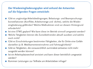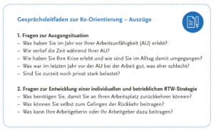 Fakten zu den Themen BEM, Selbstwirksamkeit, Gesprächsführung, Psychosomatische Sprechstunde im Betrieb und Stufenweise Wiedereingliederung lassen sich gleichfalls auf der BAuA-Website: https://www.baua.de/DE/Angebote/Publikationen/Fakten/RTW-1.html nachlesen.