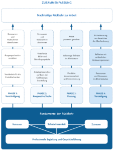 Das Vier-Phasen-Modell beschreibt einen systemisch orientierten Prozess, indem medizinisch therapeutische Maßnahmen sowie individuelle, soziale und arbeitsgestaltende Maßnahmen ineinandergreifen und sich gegenseitig ergänzen. Das Ziel ist, die Arbeits- und Leistungsfähigkeit der zurückkehrenden Mitarbeiter:innen durch eine professionelle Vorbereitung und Begleitung zu sichern bzw. im Verlauf der Wiedereingliederung zu verbessern. Die Rückkehr zur Arbeit ist in diesem Sinne individuelle Beratung und Unterstützung, Teamentwicklung bzw. Teamarbeit sowie betriebliche Organisationsentwicklung. Idealerweise steuert ein:e RTW-Expert:in diesen Prozess. Das Ziel ist eine gelingende und nachhaltige Wiedereingliederung, die durch ein BEM-Angebot des Arbeitgebers initiiert wird und von einer freiwilligen Teilnahme der BEM-Berechtigten abhängig ist. Im Mittelpunkt stehen die Zurückkehrenden und ihre RTW-Geschichten, ihr Weg in die Krise, ihre Erfahrungen, ihre Bedürfnisse und Wünsche sowie die dazu erforderlichen individuellen, sozialen und arbeitsgestaltenden Maßnahmen und Ressourcen. Dafür muss der Betrieb nicht die Diagnose kennen, sondern die aktuellen Einschränkungen der Arbeits- und Leistungsfähigkeit und wie diese überwunden werden können. Motivation, Vertrauen und Zutrauen, Akzeptanz, Selbstsorge und betriebliche Fürsorge sowie ein dialogisches Handeln sind Ausdruck dieses Prozesses.