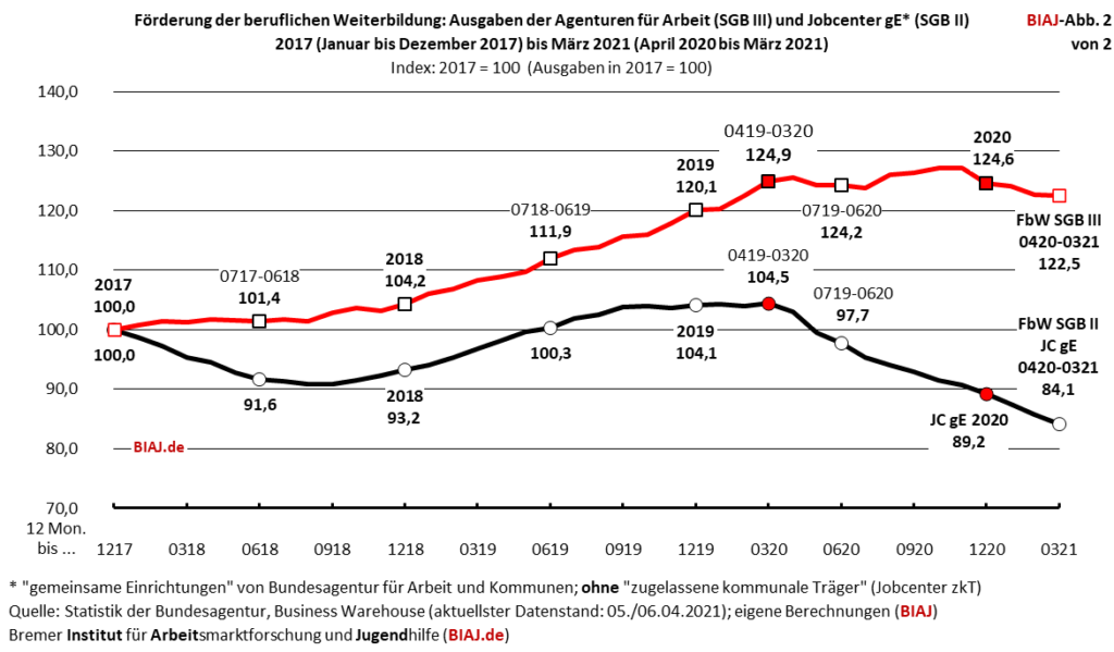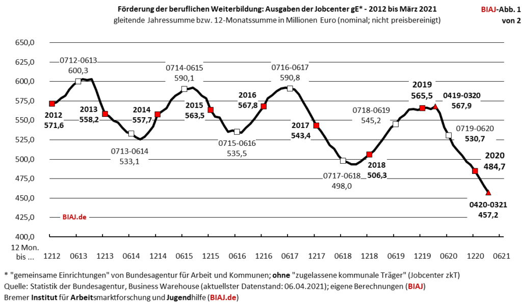Das Bremer Institut für Arbeitsmarktforschung und Jugendberufshilfe (BIAJ) zeigt die Entwicklung der Ausgaben für die Förderung der beruflichen Weiterbildung von 2012 bis 2021 auf. Im letzten Jahr (April 2020 bis März 2021) wurden nur noch 457,2 Millionen Euro für die „Förderung der beruflichen Weiterbildung“) ausgegeben, 110,7 Millionen Euro (19,5 Prozent) weniger als ein Jahr zuvor.