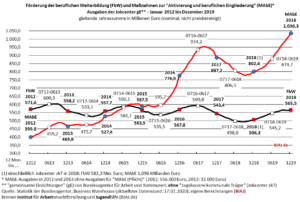 Das Bremer Institut für Arbeitsmarktforschung und Jugendberufshilfe (BIAJ) veröffentlicht eine Aufstellung über Ausgaben der Jobcenter für die Förderung der beruflichen Weiterbildung (FbW) von Januar 2012 bis Dezember 2019 und vergleicht mit der Entwicklung der Ausgaben für die “Maßnahmen zur Aktivierung und beruflichen Eingliederung” (MAbE).
