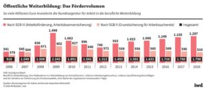 Wesentlich mehr Geld floss in Weiterbildungsmaßnahmen für Personen, die ihre Förderung nach dem Sozialgesetzbuch III bekommen. Hier flossen im Jahr 2018 fast 1,3 Milliarden Euro – im Schnitt förderte die BA jeden Arbeitslosen rein rechnerisch mit mehr als 1.600 Euro. Damit haben sich die Ausgaben je Arbeitslosen zwischen 2006 und 2018 verfünffacht – und das bei sinkender Arbeitslosenzahl.