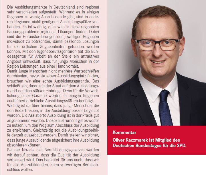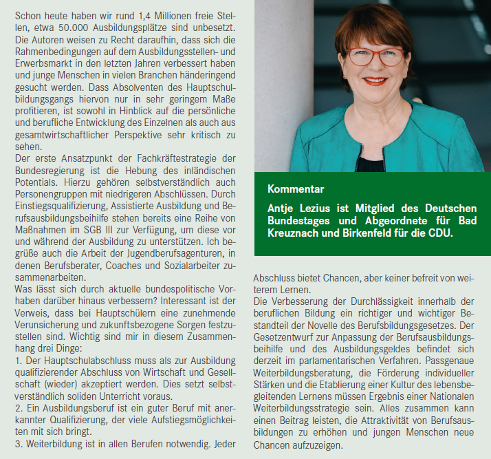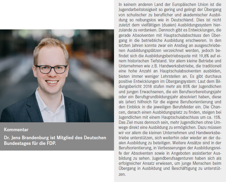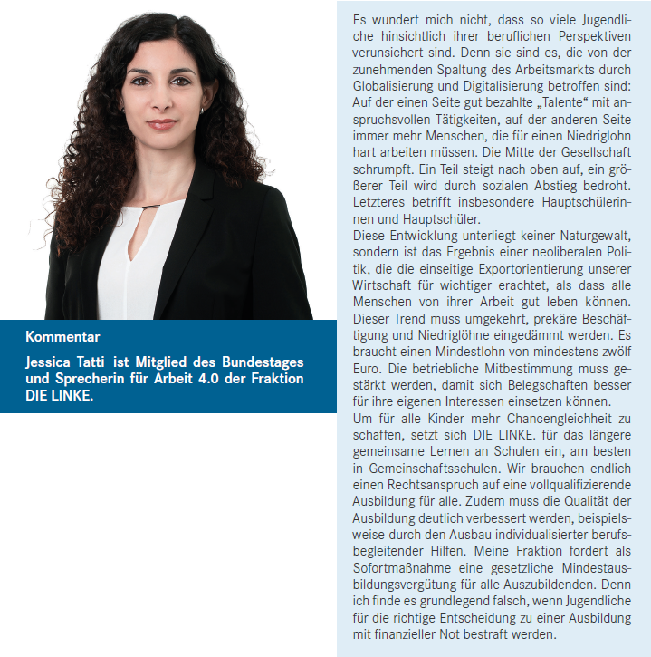 Vier Mitglieder des Bundestages, Antje Lezius (CDU), Jessica Tatti (DIE Linke), Oliver Kaczmarek (SPD) und Dr. Jens Brandenburg (FDP), kommentieren den Artikel Übergang in Ungewissheit – Junge Hauptschulabsolvent/innen auf dem Weg in Ausbildung und Erwerbsarbeit von Christine Steiner und Frank Tillmann. Erschienen in der forum arbeit 02|19. Übergang Schule- Beruf.