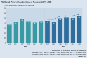 Die Weiterbildungsbeteiligung befindet sich in Deutschland seit dem Jahr 2012 auf hohem Niveau. Im Jahr 2018 waren 54 Prozent der Erwachsenen weiterbildungsaktiv.