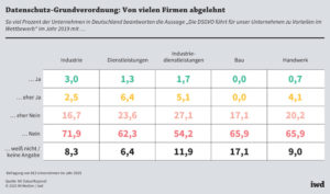 Seit Mai 2018 gilt die Europäische Datenschutz-Grundverordnung (DSGVO) – doch noch immer tun sich die meisten Unternehmen in Deutschland schwer damit. Statt Rechtssicherheit zu schaffen, verunsichern die neuen Regeln die Firmen, hinzu kommt ein hoher personeller und finanzieller Aufwand für die Umsetzung, so das iwd (Institut der deutschen Wirtschaft Köln e.V.).