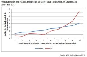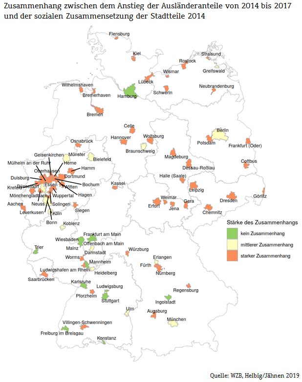 Die soziale Spaltung nimmt in vielen deutschen Städten weiter zu. Verschärft wurde diese Entwicklung durch den Zuzug von Zuwanderern. So ist der Anteil von Ausländern besonders in den sozial benachteiligten Stadtteilen gestiegen, wie die Studie Wo findet Integration statt? des Wissenschaftszentrums Berlin für Sozialforschung (WZB) zeigt. Für 86 Städte wurde erstmals untersucht, wie sich Zuwanderer im Zeitraum von 2014 bis 2017 in den Städten räumlich verteilen.