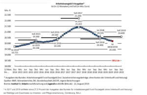Das Bremer Institut für Arbeitsmarktforschung und Jugendberufshilfe vergleicht Arbeitslosengeld-II- und Sozialgeld-Ausgaben bis Juli 2019.