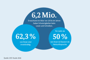 Das zeigt die neue Grundbildungsstudie “LEO 2018 – Leben mit geringer Literalität” der Universität Hamburg. . Danach gibt es in Deutschland noch rund 6,2 Millionen Erwachsene, deren Lese- und Schreibkompetenzen für eine volle berufliche, gesellschaftliche und politische Teilhabe nicht ausreichen. 2011 waren es noch 7,5 Millionen, also etwa 1,3 Millionen mehr.