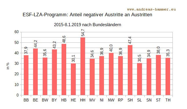 Das vom Europäischen Sozialfonds (ESF) finanzierte Förderprogramm des Bundes zugunsten langzeitarbeitsloser Leistungsberechtigter läuft nun schon seit 2015. Neue Eintritte sind nicht mehr möglich, weil das Programm ausläuft. Zum 8.1.2019 liegen neue Daten dafür vor. Von Interesse ist die von Andreas Hammer ausgewertete Zahl der Abbrüche.