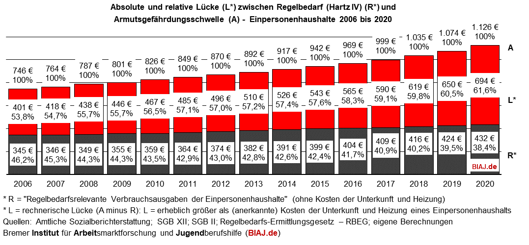 Weiterführender Link: Absolute und relative Lücke zwischen Regelbedarf (Hartz IV) und Armutsgefährdungsschwelle 2006-2020
