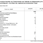 Im Jahr 2019 traten 1964 Teilnehmende aus der Förderung „Teilhabe am Arbeitsmarkt“ (§16i SGBII) aus. Im Jahr 2020 weitere 4275 Personen (ohne Daten zu den kommunalen Trägern). Auffällig ist: In beiden Jahren ist fast die Hälfte der vorzeitigen Austritte auf eine Kündigung durch den Arbeitgeber zurückzuführen.