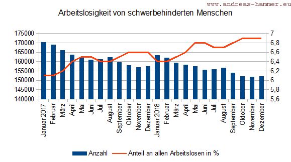 Zwar hat die Zahl der arbeitslosen Menschen mit Behinderung hat in den Jahren 2017 und 2018 absolut abgenommen. Allerdings ist ihr Anteil an allen Arbeitslosen gestiegen.