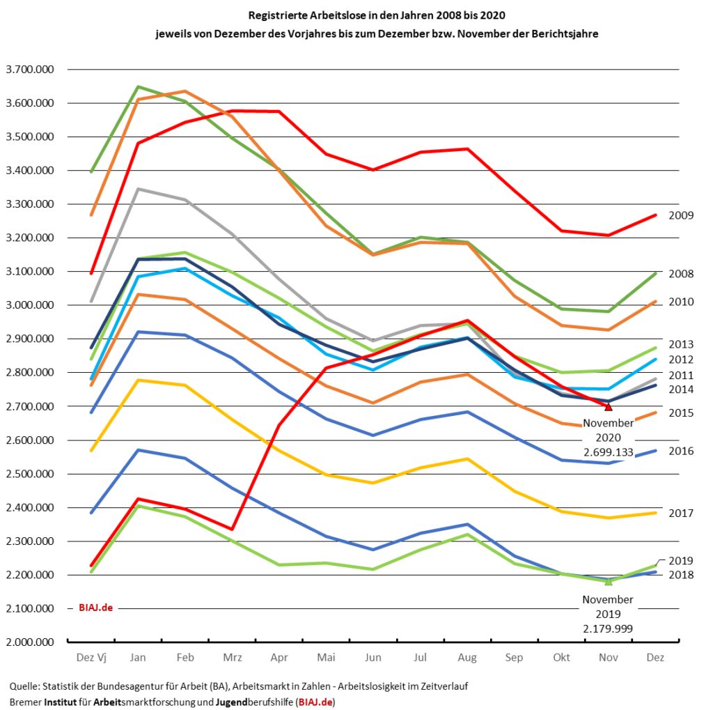 Im November 2020 gibt es 2,699 Millionen registrierte Arbeitslose. Im Ländervergleich reichten die Veränderungsraten (im Vorjahresvergleich) bei den registrierten Arbeitslosen insgesamt von +9,4 Prozent in Sachsen-Anhalt (ST), bis +36,0 Prozent in Berlin (BY).