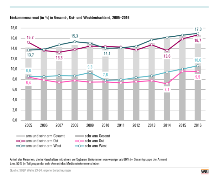 Die Schere bei den verfügbaren Einkommen hat sich in Deutschland weiter geöffnet, die Einkommensungleichheit befindet sich trotz der über Jahre guten wirtschaftlichen Entwicklung auf einem historischen Höchststand. Das zeigen übereinstimmend Berechnungen mit unterschiedlichen statistischen Maßen zur Einkommensverteilung. So lag der Gini-Koeffizient, das gebräuchlichste Maß für Ungleichheit, Ende 2016 sogar noch um zwei Prozent höher als 2005 – dem Jahr, das unter Forschern nach einem drastischen Anstieg der Einkommensspreizung seit Ende der 1990er Jahre als besonders „ungleich“ gilt. Zwei Faktoren haben die materielle Ungleichheit in den vergangenen Jahren vor allem wachsen lassen: Hohe Einkommensgruppen haben von sprudelnden Kapital- und Unternehmenseinkommen profitiert und dadurch die große Mehrheit der Haushalte in Deutschland beim verfügbaren Einkommen deutlich hinter sich gelassen. Gleichzeitig sind die 40 Prozent der Haushalte mit den geringsten Einkommen zurückgefallen – auch gegenüber der Mitte, deren Einkommen wiederum durch die gute Arbeitsmarktlage und spürbare Lohnsteigerungen real solide zunahm. Dementsprechend liegt die Armutsquote ebenfalls auf hohem Niveau. Und die Armutslücke, sie beschreibt das Jahreseinkommen, das armen Haushalten rechnerisch fehlt, um die Armutsgrenze von 60 Prozent des mittleren Einkommens zu überschreiten, ist zwischen 2011 und 2016 preisbereinigt um 29 Prozent gewachsen: Um 779 Euro auf mehr als 3400 Euro. Zu diesen Ergebnissen kommt der neue Verteilungsbericht des Wirtschafts- und Sozialwissenschaftlichen Instituts (WSI) der Hans-Böckler-Stiftung. Basis der Studie sind die aktuellsten vorliegenden Daten aus dem Sozio-oekonomischen Panel (SOEP), der größten repräsentativen Panel-Befragung in Deutschland, für die jährlich über 25.000 Menschen in Deutschland interviewt werden.