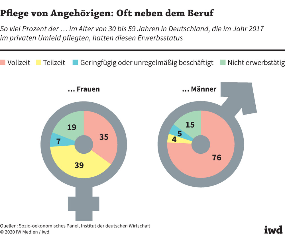 Im Jahr 2017 arbeiteten 76 Prozent der männlichen, aber lediglich 35 Prozent der weiblichen Pflegenden im Alter von 30 bis 59 Jahren in Vollzeit. Zugleich waren 39 Prozent der pflegenden Frauen dieser Altersgruppe in Teilzeit beschäftigt – aber gerade einmal 4 Prozent der Männer.