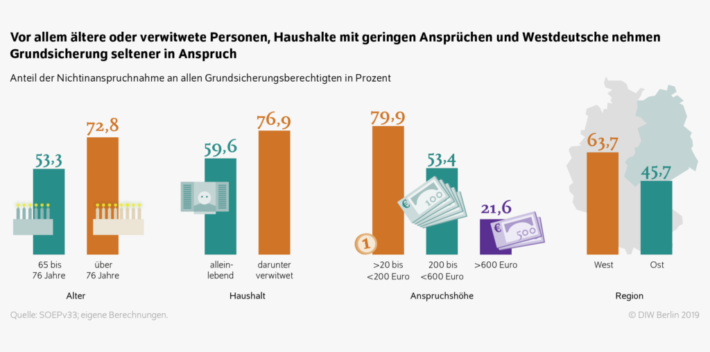 hoch liegt sie bei Haushalten mit geringen Ansprüchen an die Grundsicherung, bei Menschen ab 77 Jahren und Wohneigentümer*innen. Häufiger wird die Grundsicherung in Anspruch genommen, wenn die Ansprüche relativ hoch oder nur niedrige sonstige Einkommen vorhanden sind. Die Haushalte, die ihren Anspruch nicht wahrnehmen, könnten ihr Einkommen durchschnittlich um fast 30 Prozent steigern. Um zumindest der Nichtinanspruchnahme aus Scham oder Unwissenheit vorzubeugen, sollten die Verfahren bei der Antragstellung vereinfacht und einer Stigmatisierung durch eine Betonung des Rechtsanspruchs auf die Leistung entgegengetreten werden.