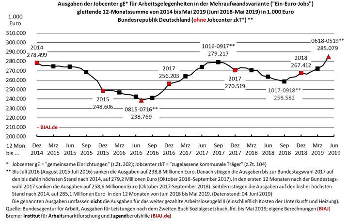 Übersicht des BIAJ zur Entwicklung der Ausgaben für “Ein-Euro-Jobs” von 2014 bis Mai 2019. Hier stellt das Bremer Instiuts für Arbeitsmarktforschung und Jugendberufshilfe (BIAJ) auch Informationen zu einzelnen Bundesländern zur Verfügung. In den Ländern stellt sich die Entwicklung dieser Ausgaben des Bundes teilweise sehr unterschiedlich dar.