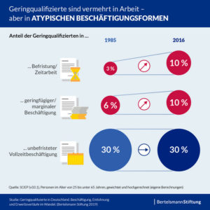 Die Bertelsmann Stiftung hat Beschäftigung, Entlohnung und Erwerbsverläufe im Wandel untersucht. Je geringer die Qualifikation, desto schlechter die Aussichten auf gute Jobs, angemessene Löhne und beruflichen Aufstieg. Im internationalen Vergleich zeigt sich, dass Geringqualifizierte in Deutschland häufiger im Niedriglohnsektor arbeiten und ein niedrigeres Niveau an Grundkompetenzen haben.