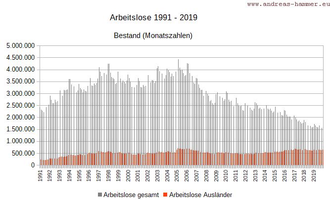 In seiner Auswertung von 1991 bis 2019 zeigt Andreas Hammer deutlich: die positive Konjunkturentwicklung hat zu einem Rückgang der Arbeitslosen insgesamt geführt, dies Entwicklung ging allerdings an den arbeitslosen Ausländer*innen vorbei. Laut Hammer, wird dies auch nicht durch Förderprogramme und das Teilhabechancengesetz kompensiert, da deren Umfang zu klein ist und Ausländerinnen und Ausländern dort unterrepräsentiert sind. Es besteht weiterer Handlungsbedarf.