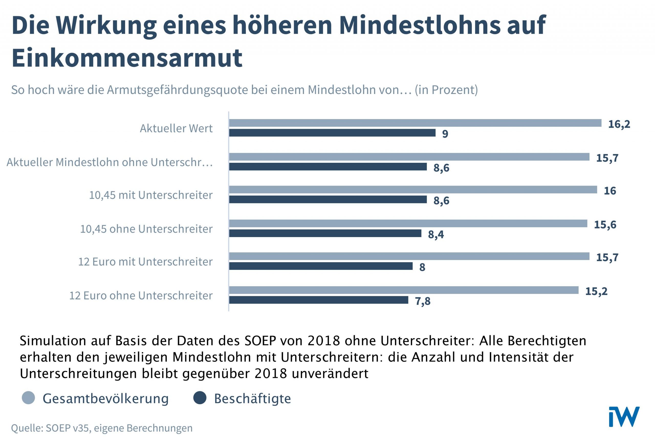Die Simulation zeigt, dass die Einhaltung des Mindestlohns mindestens ebenso wichtig ist wie das Mindestlohnniveau. Gäbe es keine Mindestlohnunterschreitungen, könnte die Armutsgefährdungsquote in der Bevölkerung um rund einen halben Prozentpunkt gesenkt werden ohne dass der Mindestlohn erhöht werden müsste.