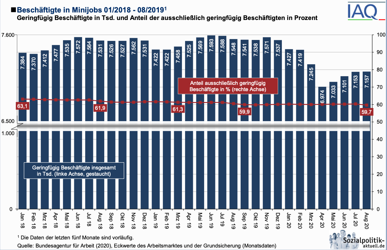 Nach den Daten der Bundesagentur für Arbeit haben bis zum Frühjahr 2020 mehr als eine halbe Mio. Beschäftigte ihren Minijob verloren. Waren es im Dezember 2019 noch rund 7,6 Mio., so hat sich die Zahl bis zum April 2020 auf 7 Mio. reduziert.