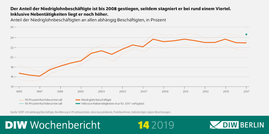 Der Anteil der Niedriglohnbeschäftigten stagniert seit 2008 bei etwa einem Viertel – Rund neun Millionen Beschäftigungsverhältnisse mit Niedriglöhnen, inklusive Nebentätigkeiten – Besonders junge Erwachsene, Frauen, MigrantInnen und Ostdeutsche erhalten überdurchschnittlich häufig Niedriglöhne – Neue Minijobregelungen, bessere Qualifizierung und offensivere Lohnpolitik können helfen, den Niedriglohnsektor einzudämmen, so das DIW Berlin in seinem aktuellen Wochenbericht.