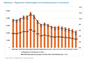 Ebenfalls problematisch ist die häufig schwierige Situation langzeitarbeitsloser Menschen, also solcher Personen, die ein Jahr oder länger arbeitslos sind (für die nachfolgenden Informationen siehe auch BA 2019). Im Jahr 2018 waren von jahresdurchschnittlich 2,34 Millionen Arbeitslosen rund 800.000 oder knapp 35 Prozent langzeitarbeitslos.